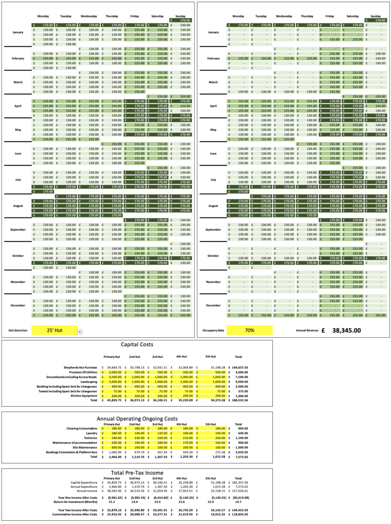 We have created this easy to use tool to help you forecast your return on a Shepherds Hut. You can download the tool here and simply select your hut type from the yellow drop down, set your expected occupancy rate on the right and the tool will help calculate your expected annual revenue. You can then enter your capital costs in the table below to establish your full investment requirement to set up your perfect glamping site. You can then also look at the ongoing annual costs to help establish the potential profitability of your hut and also the return on investment period for you to recover your initial capital.